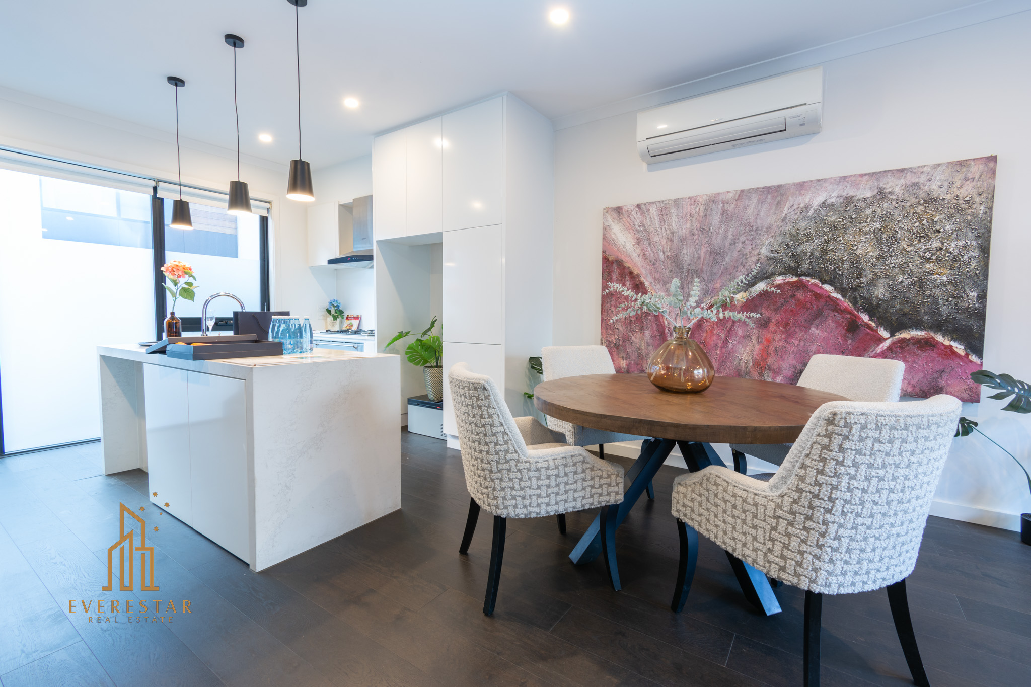 The middle level serves as the vibrant heart of the home, featuring an expansive open-plan living, dining, and kitchen area. Here, the sleek stone island bench and premium