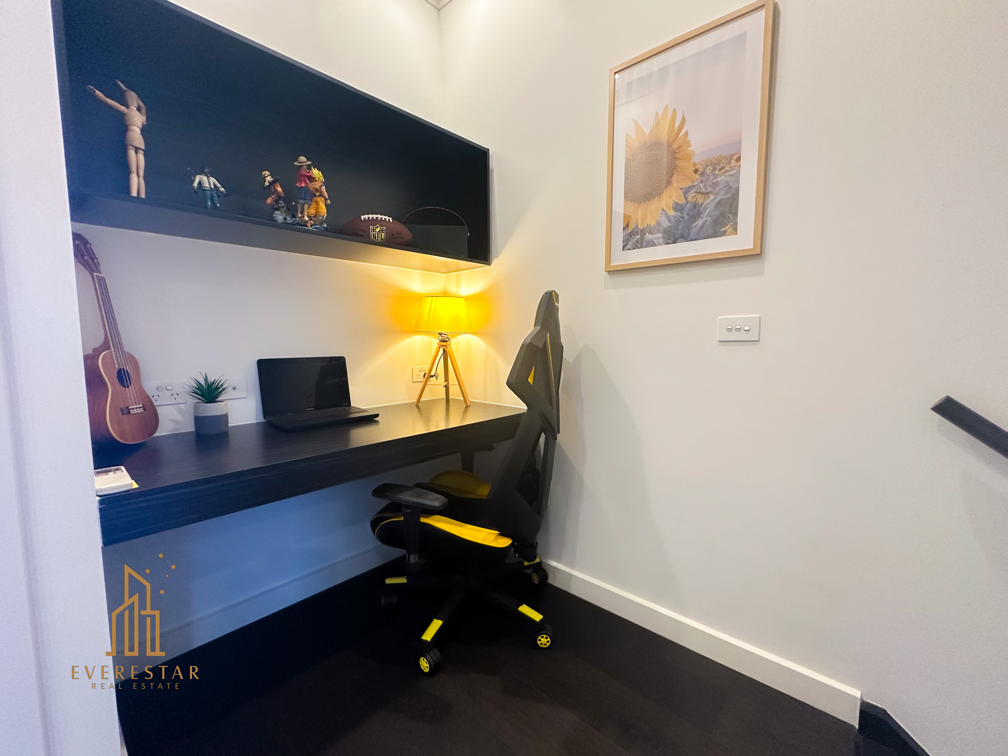 The ground floor offers a private retreat for guests, complete with a large bedroom, ensuite, and access to a serene courtyard. The top floor houses two generously sized bedrooms with built-in robes, including a master suite with an ensuite. A third bathroom serves the second bedroom, and a built-in study nook provides a dedicated workspace. Split-system heating and cooling throughout ensures comfort, while the Euro laundry and secure single-car garage add to the convenience.